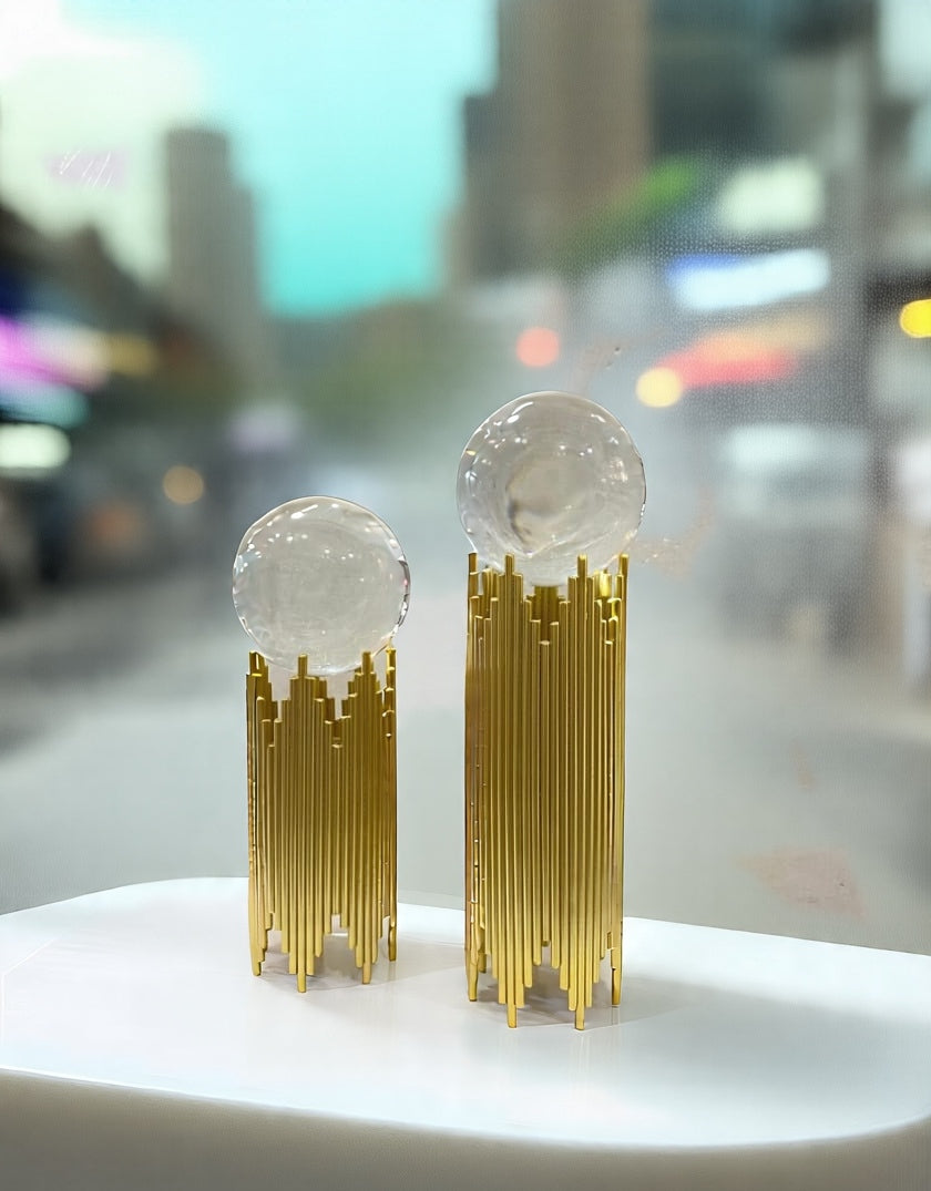 - Two glass spheres of different sizes, each perched atop a gold metal base resembling a cityscape or abstract design.